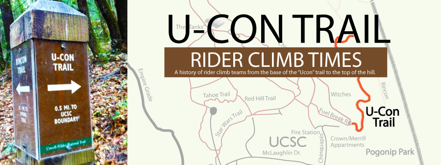 This page lists a history of various team's rider times for climbs up the U-Con or University Connector Trail in UCSC. This short half mile climb has proven to be a good gauge for a rider's fitness and is often used to measure development over a session.